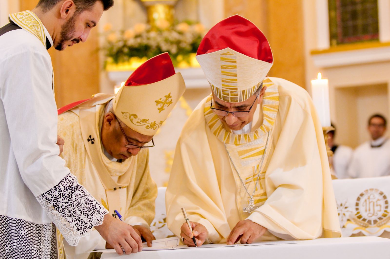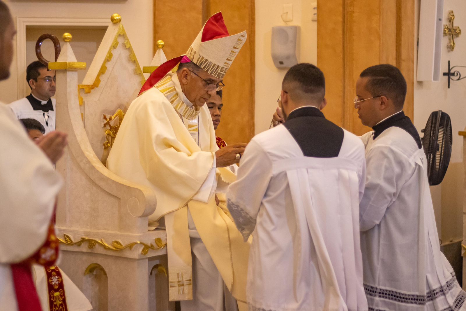 Com as melodias do canto de entrada entoadas pelo coral, teve início a celebração oficial. Na sequência, o chanceler da Diocese de Campo Maior, padre Francisco Euller, foi convidado a apresentar as letras da Bula Apostólica, procedendo-se à leitura do documento pontifício que nomeia Dom Benedito Araújo como bispo diocesano de Campo Maior. Após a leitura, Dom Juarez Marques entregou o báculo pastoral a Dom Benedito Araújo, símbolo da autoridade e da missão confiadas ao novo bispo como pastor da Diocese de Campo Maior. Em gesto fraterno, o arcebispo o abraçou, seguido das saudações dos membros do Colégio de Consultores, bem como dos padres e diáconos que compõem o clero diocesano.